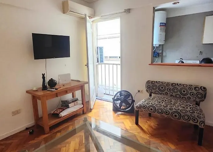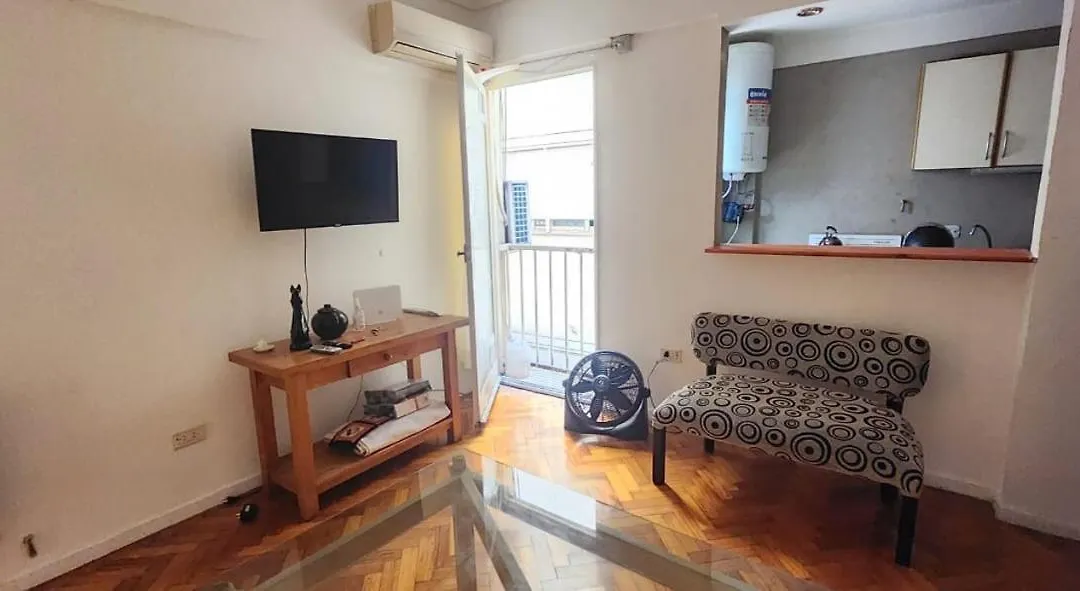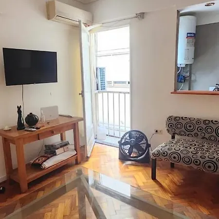 Departamento En Buenos Aires Apartment comprises a balcony and a sitting area, appointed with a sofa set. Guests can enjoy media amenities such as a flat-screen TV with satellite channels, along with air conditioning for their comfort. A bathroom is equipped with a bidet, a bath, and a shower, as well as shower caps and towels.